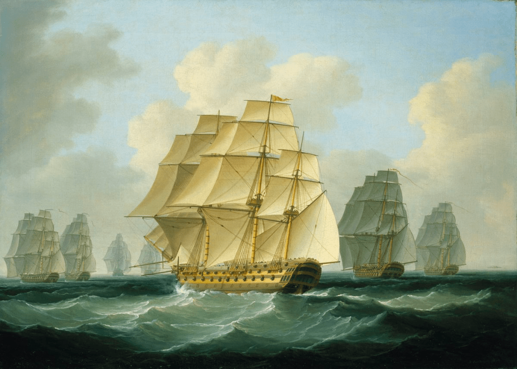 Strachan’s ships, despite being scattered, immediately gave chase. The exchange of fire began at 5:45 AM between the frigate HMS Santa Margarita and the 74-gun Scipion. The British frigates continued to slow Dumanoir until Strachan’s ships of the line eventually caught up. Realizing that a general engagement was inevitable, the French admiral formed his line and engaged the Royal Navy ships.