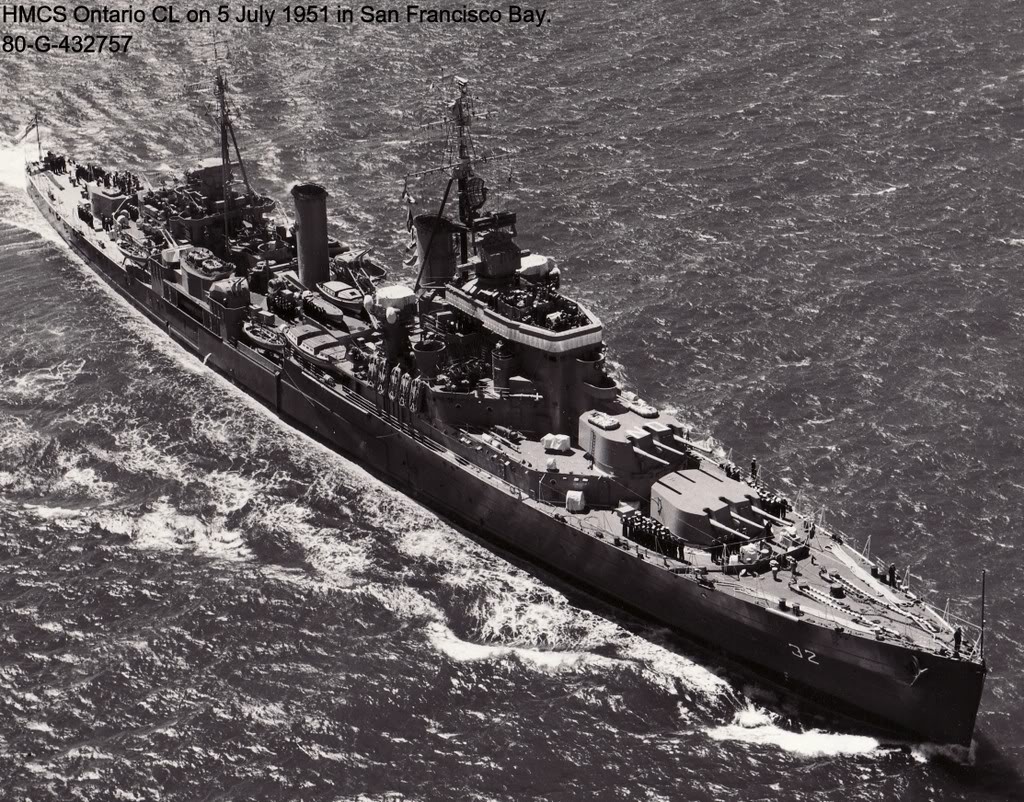 HMCS Ontario was a Minotaur-class light cruiser launched in 1943 by Harland & Wolff in Belfast. She was commissioned into the Royal Canadian Navy on 25 May 1945 as HMCS Ontario. Completed too late to participate in World War II, she nonetheless served Canada with distinction until 1958, demonstrating Canada’s commitment to the newly established world order.