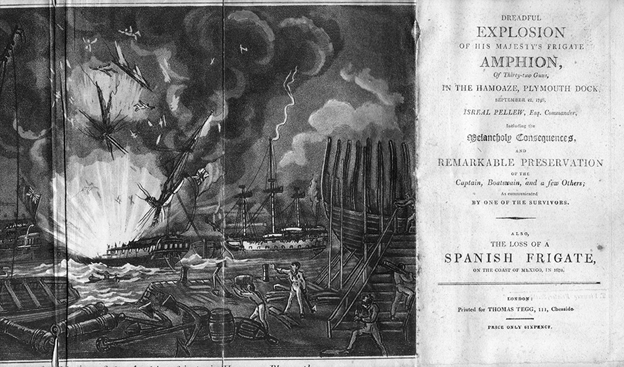 It all began with a hissing noise that was followed by a rumble. Sensing danger, Israel and the lieutenant scrambled to their feet and ran towards the quarter galley. Almost immediately, a huge explosion rent through the fore part of the ship, blasting it to fragments. The remaining part of the Amphion shot upwards, almost revealing her keel, her masts were launched higher into the air than the sheer hulk alongside, the shockwave shook the dockyard and residences nearby, and the boom was loud enough to be heard at Stonehouse two miles away. Ashore, the people of Plymouth scattered in great confusion as the sky turned red.