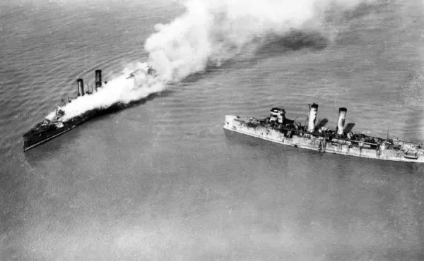 Then things went terribly wrong for the advancing Inshore Force. Strong winds blew the smoke screen into the cruisers’ faces, blinding their commanders who had to navigate by dead reckoning. The same wind then revealed them to German defenders, who opened heavy fire on the blockships. Despite casualties, the crews pressed on, searching for the Stroom Bank buoy guiding ships into the canal.
