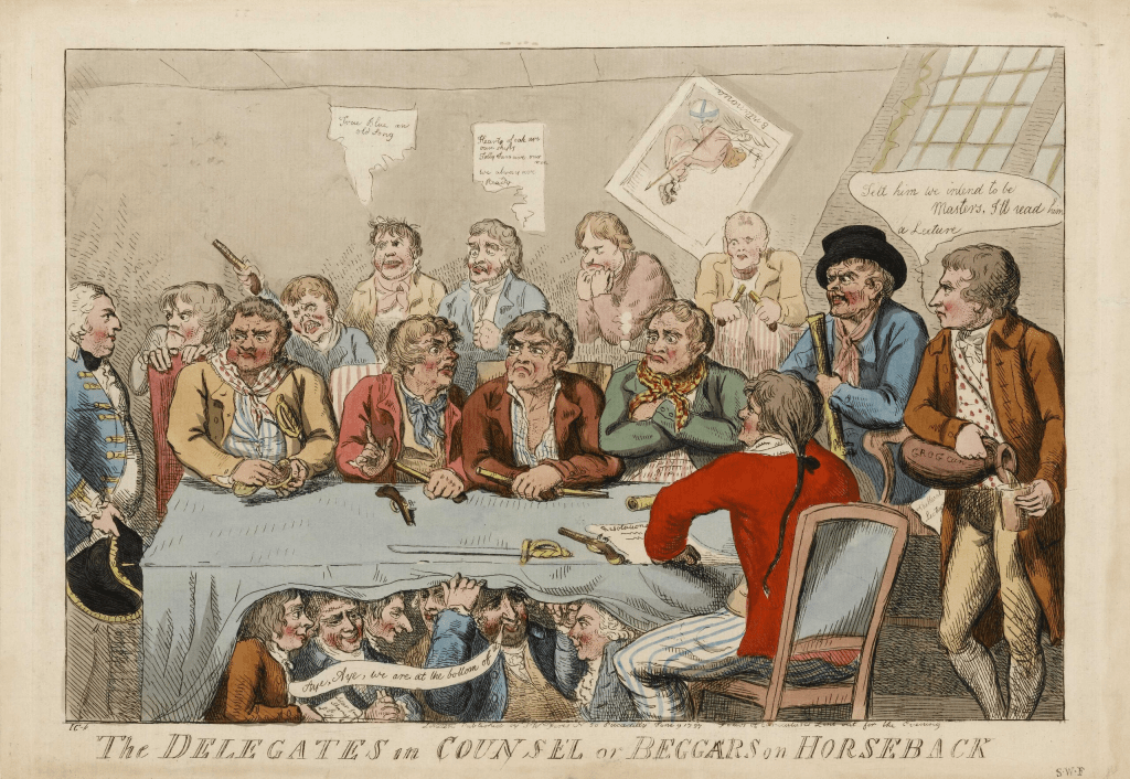 - The most recognisable image associated with the 1797 mutinies is the caricature ‘Delegates in Council’ by Isaac Cruikshank. It shows a meeting of mutinous sailors held in a captain’s cabin. Behind them on the wall are a set of posters including a picture of Britannia turned upside down and the words to ‘Hearts of Oak’ with ‘Ready’ crossed out. NMM PAG8535. ↩︎
